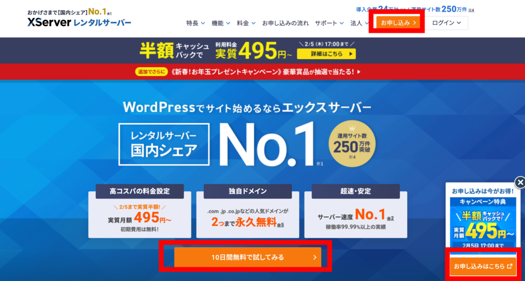 エックスサーバーにアクセスして、画像の赤枠から申し込みます。