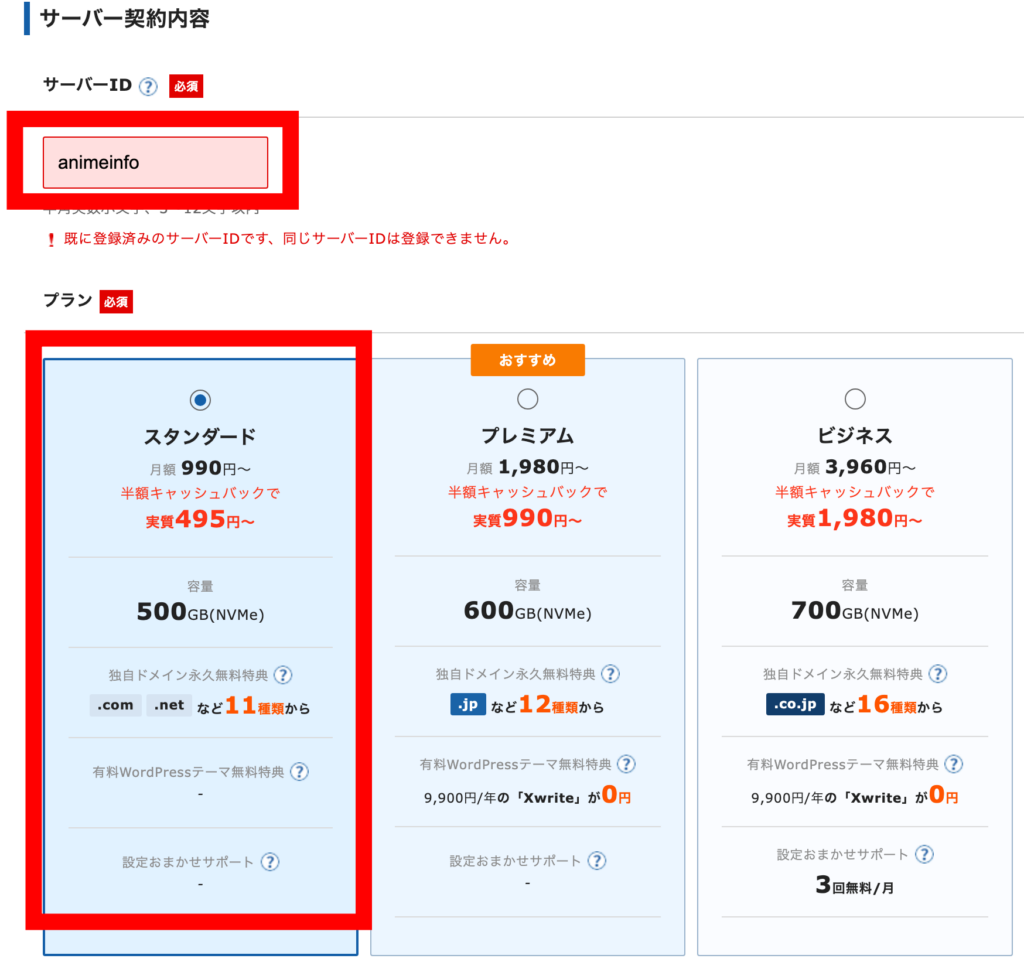 ドメインを選ぶ時に、すでにネット上に存在するドメインを選んでしまった場合はエラーになります。