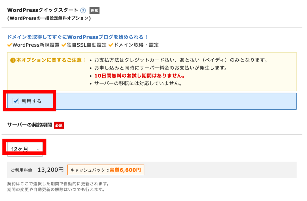 「利用する」にチェックし、サーバーの契約期間を選びます。