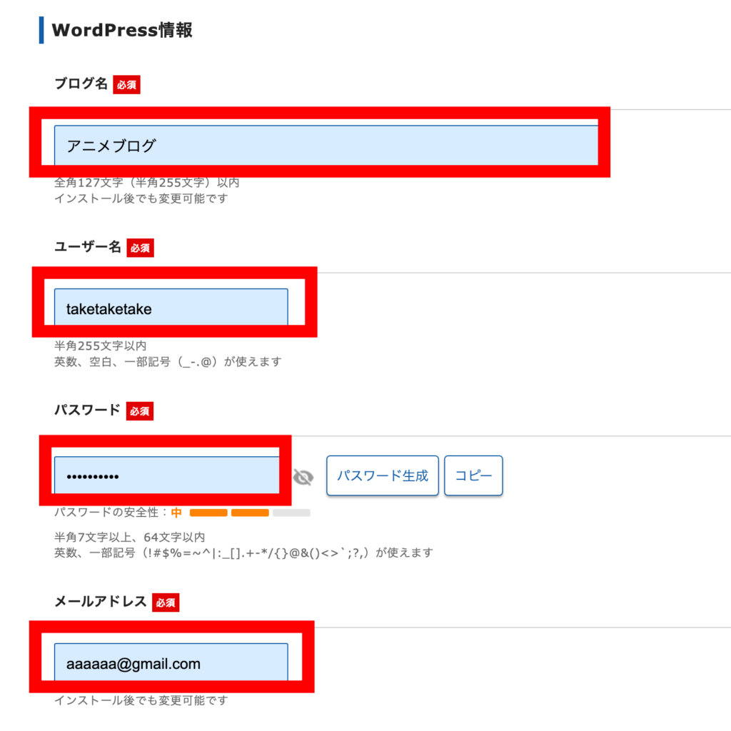 ユーザー名とパスワードはWordPressにログインするときに必要なので、メモをしておくようにしましょう。