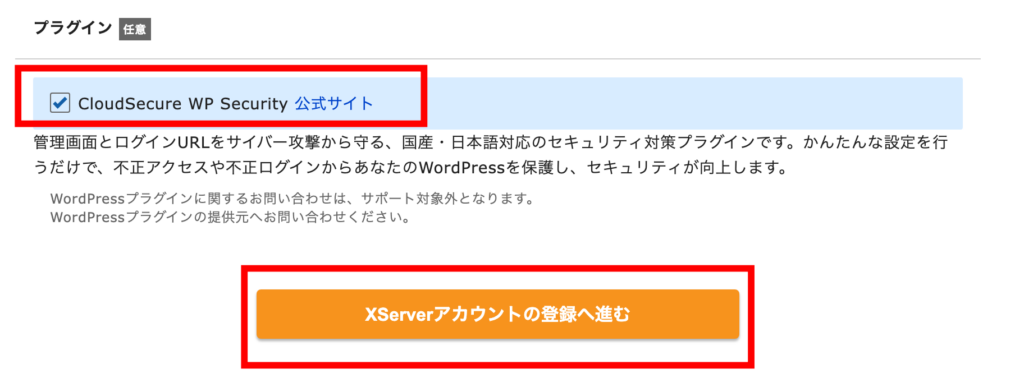 最後にプラグインをチェックして、エックスサーバーの登録へ進みます。